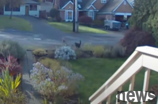 Originally, the coyote planned to walk out to the yard and hang out, but it seemed to be frightened by Kevin's sharp eyes. After pausing in place for several seconds, it decided to walk aside first. At this time, Kevin suddenly jumped off the handrail of the stairs and ran in the direction of the coyote. However, the coyote thought that the guard cat was just temporarily. He left his job at the time, so he took the opportunity to turn around and walk to the lawn of the yard, planning to sneak into his home for an adventure. Unexpectedly, this move directly aroused Kevin's anger. Without saying a word, it flew towards the coyote, which scared the coyote and ran to the other side of the street. In the end, Kevin stood in the middle of the road to make sure that the coyote would not come near his home again.