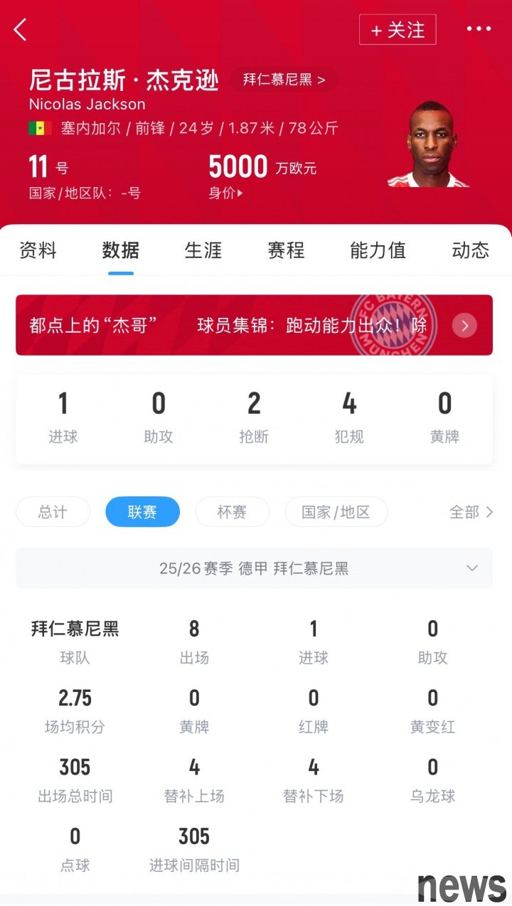 In addition, since Musiala's comeback is imminent, this may further reduce Jackson's playing time. The forwards such as Dias, Olise and Kane have firmly occupied the main positions, and their role in Bayern is almost irreplaceable.