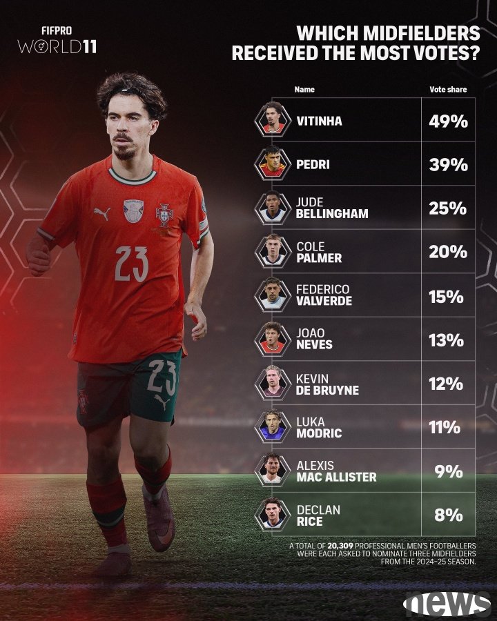 The FIFPRO Annual Eleven is voted for by professional players around the world and is the only global award in football that is entirely decided by players. The performance reference time for selection is from July 15, 2024 to August 13, 2025, during which they must participate in at least 30 official games.