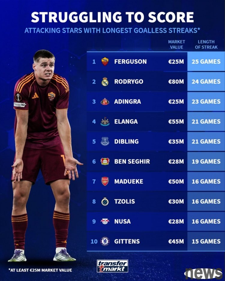 The German transfer market took stock of the number of games without scoring goals for offensive players and listed them. Evan Ferguson had 25 games and Rodrigo had 24 games.