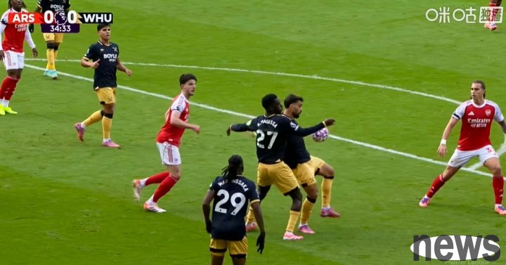 Premier League 7th round, Arsenal vs. West Ham United. In the 33rd minute of the game, West Ham United player Magasa touched the ball with his hand in the penalty area. The referee did not say that VAR did not intervene.