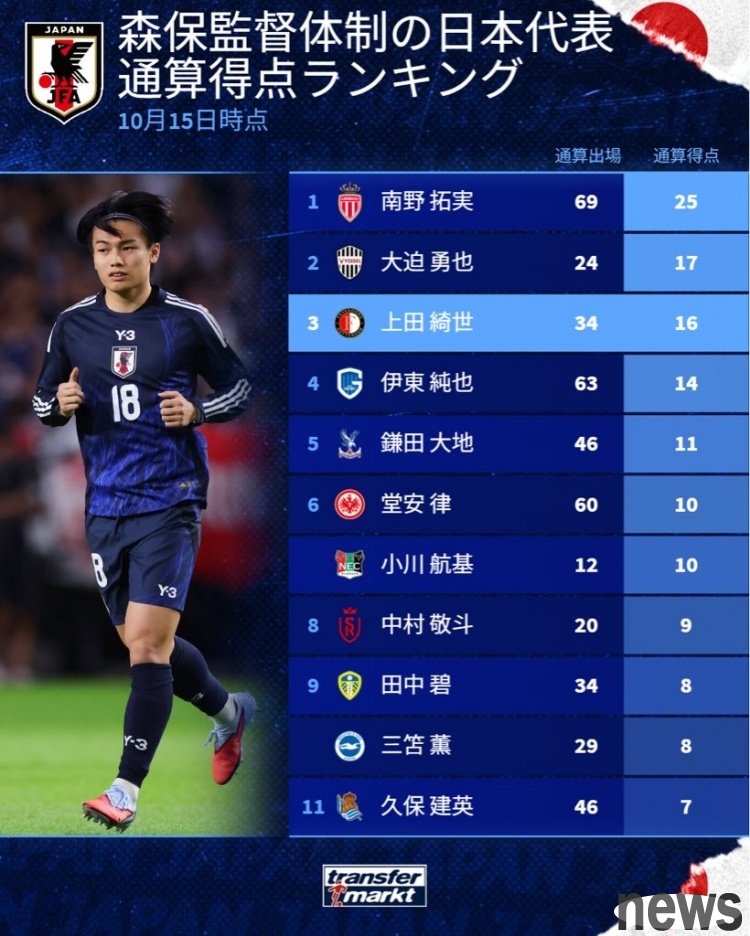 Today Dezhuan listed the Japanese team's scorer list under Mori Yasuichi, with Minamino Takumi leading the way with 25 goals, Osako Yuya and Ueda Qiyo ranking second and third with 17 goals and 16 goals respectively, "Saginuma Brothers" Misaki Kaoru and Tanaka Aichi both scored 8 goals and tied for 9th, and Kubo Takehide ranked 11th with 7 goals.